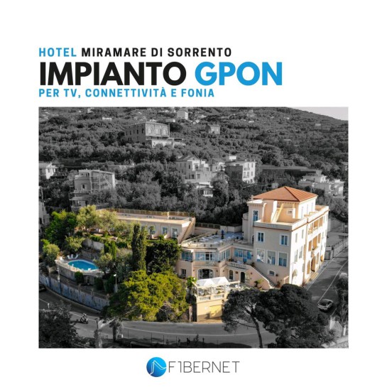 Realizzazione impianto LAN OTTICA FTTH in tecnologia GPON per la distribuzione dei servizi TV,fonia e connettività WiFi e cablata all'interno delle camere,delle aree comuni e degli uffici dell'Hotel Miramare Sorrento utilizzando apparecchiature forniteci dalla FIBERNET srl.